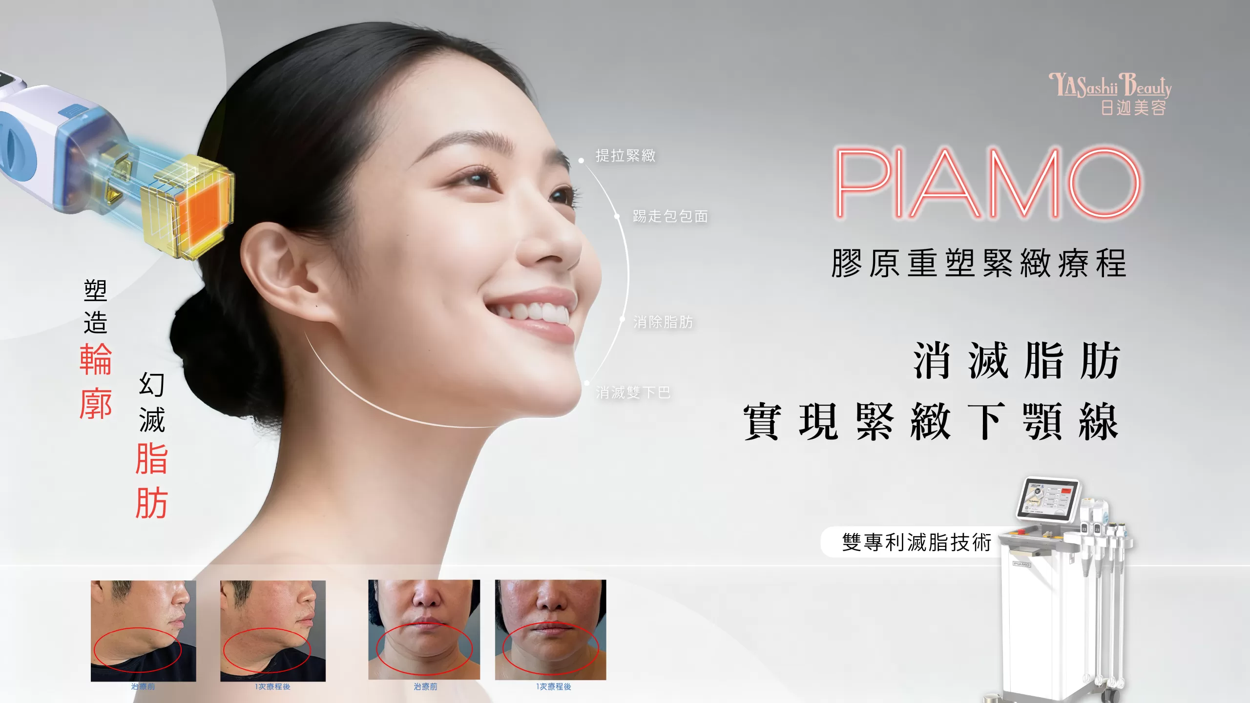 不論是天生「包包面」,又或是年紀漸長變得鬆弛而出現的雙下巴。面部浮腫、欠缺線條輪廓除了會顯肥外,更加會顯老。因此,為了對付包包面及下垂皺紋,Yasashii Beauty推出「PIAMO瘦面緊緻療程 」。利用雙專利技術HIFER™四環聚焦加熱升溫,將面部脂肪分解。PVP™脈衝負壓為皮膚提拉收緊,踢走皺紋鬆弛,同步刺激膠原蛋白再生,瘦面同時緊緻,打造線條流暢緊實的面部線條,令你擁有精緻的V面輪廓。