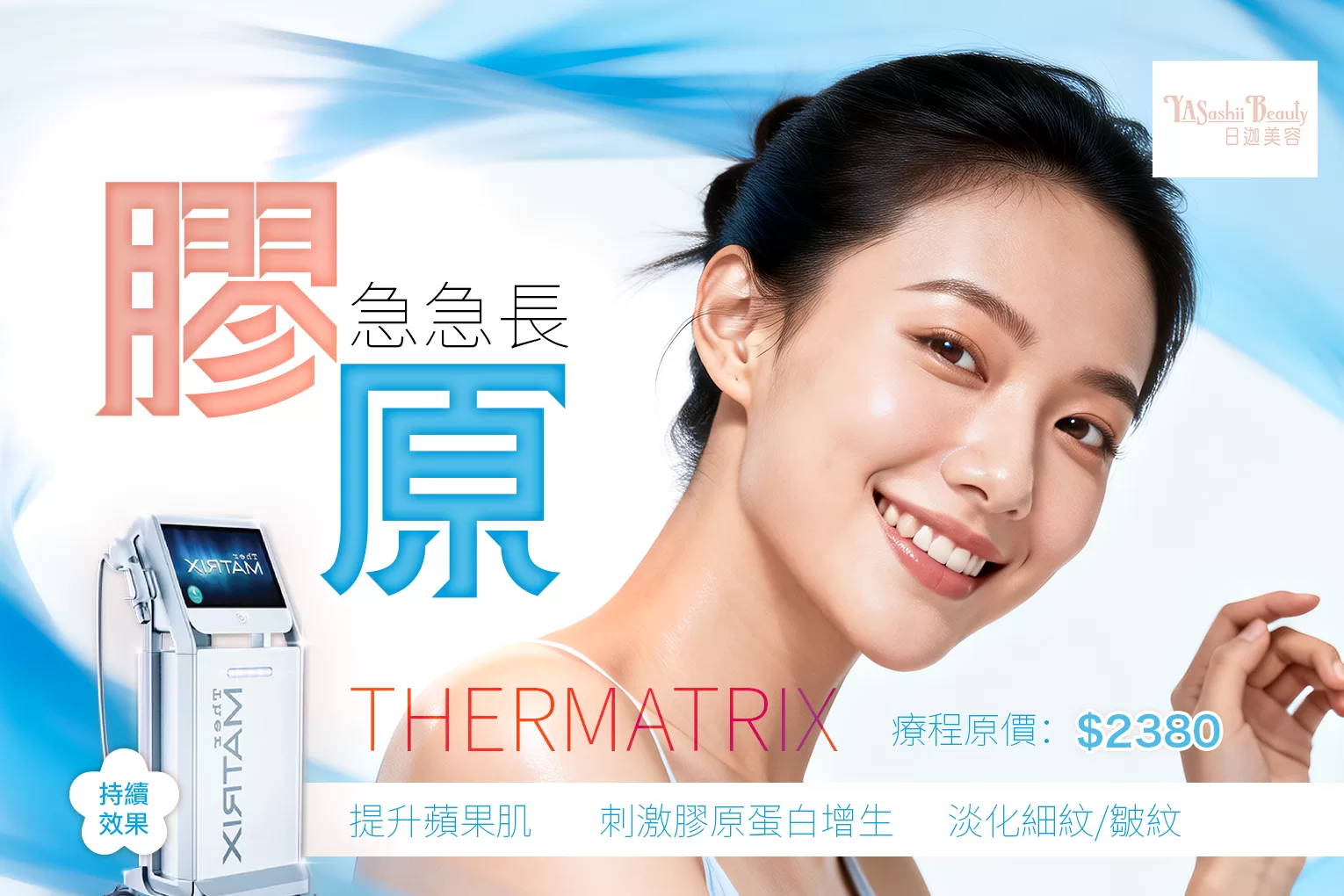 年輕是十八廿二,然而你可能不知道,皮膚的膠原蛋白會在20歲開始悄悄流失,25歲後就更為明顯,缺水、乾紋、鬆弛等症狀就會逐一現身,要補充膠原蛋白,單靠日常護理實在效果有限,日迦美容為你特別推出「TherMatrix 膠原槍」,是非一般的膠原再生療程,助你延緩衰老。